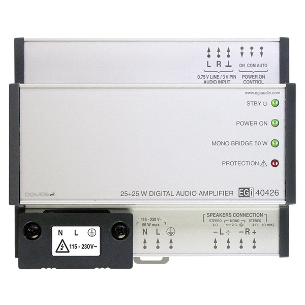 El amplificador digital de EGI 40426 tiene un tamaño reducido con alta eficacia en consumo de energía y baja transmisión de calor; permite amplificar señales estéreo o mono. Ideal para conectar con mandos y módulos de EGI.