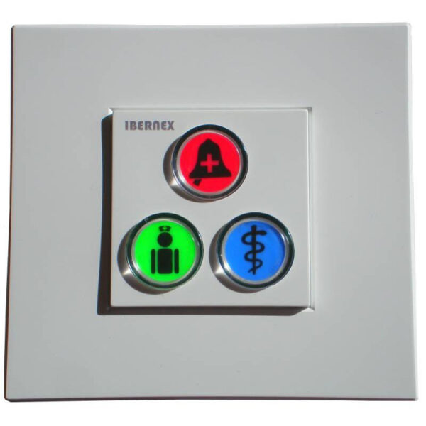 El módulo IBERNEX NX0392 proporciona un botón rojo para generación de alarmas y un botón verde para indicar presencia de personal, un botón azul para alarma médica. Además, su lector RFID integrado permite registrar la presencia del personal y de esta manera llevar un control detallada de las atenciones realizadas. Generalmente se instala un módulo por habitación en ubicación cercana de la entrada para que el personal sanitario pueda registrar su presencia al ingresar y salir de habitación.