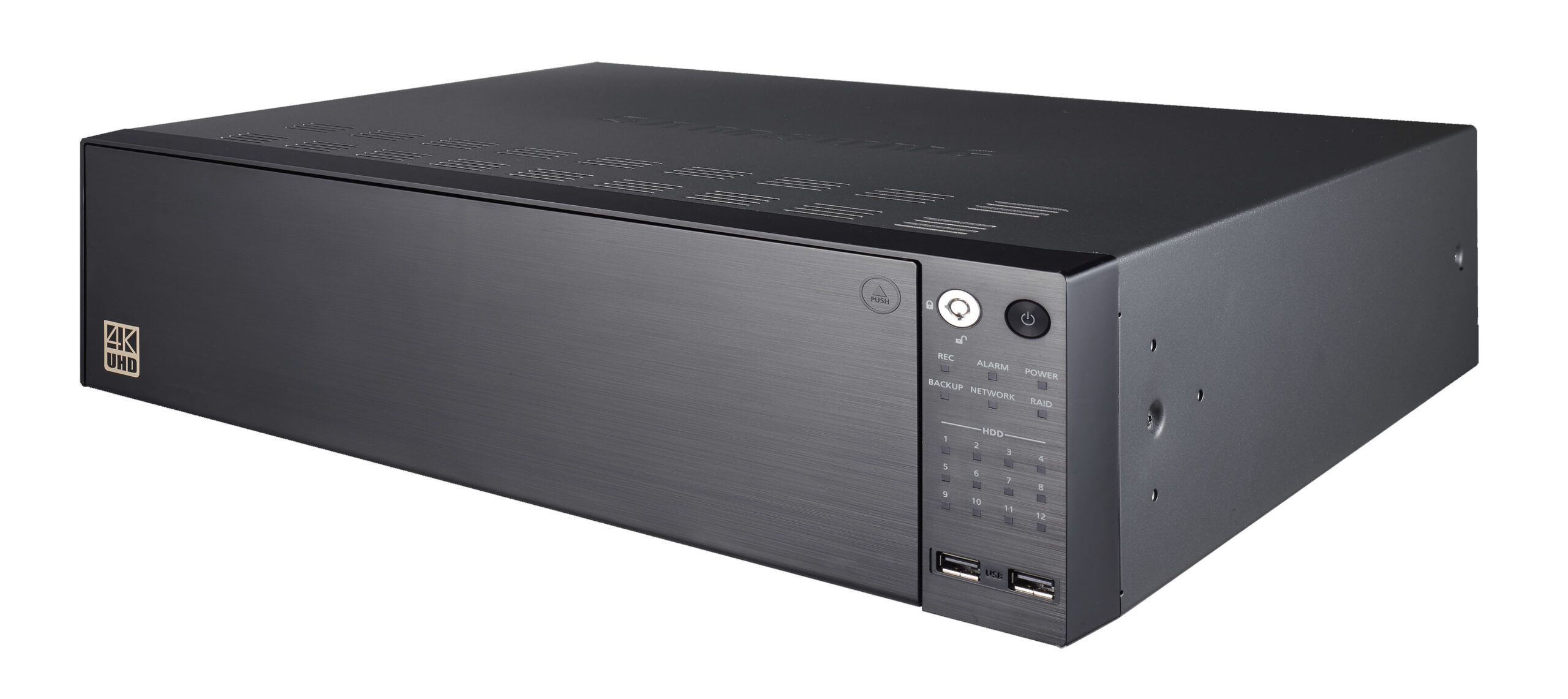 - Panel Frontal Indicador LED (indicador de estado): Acción disco duro 12, estado RAID 1, Alarma 1, Alimentación 1, Grabación 1, Respaldo 1, Red 1, USB 2